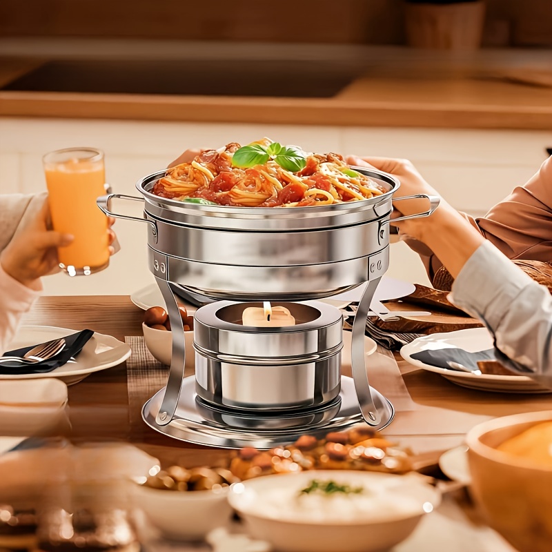Single Unit Buffet Hot Pot Cooker (Includes Lid, Rack, And Pot) Designed for Use. This Round Hot Pot Cooker Features a Glass Lid And Is Ideal for Individual Servings, Made of Stainless Steel